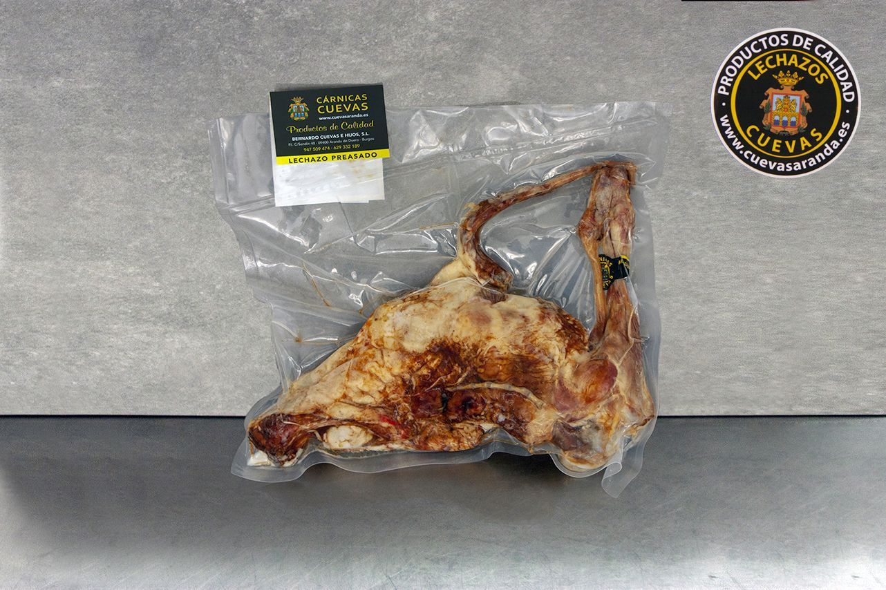 Ejemplar parcial de lechazo, consistente en uno de los cuartos traseros del lechazo. La carne está pre-asada, siendo únicamente necesario, un horneado final de 15 minutos. El pedido se sirve envasado al vacío.