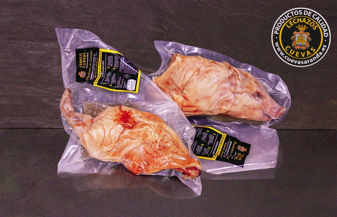 Ejemplar parcial de cochinillo,correspondiente a la mitad de la pieza. La carne está pre-asada, siendo únicamente necesario, un horneado final de 15 minutos. El pedido se sirve envasado al vacío.